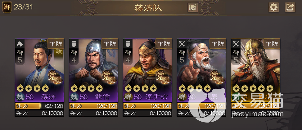 该阵容属于比较便宜的一套阵容,主要针对平民和零氪玩家,其中黄忠是核心输出,他凭借战法所提供的额外射程和伤害可以保证全场下来都有不错的输出表现,然后淳于琼和鲍信本身属于前排,前者能绑定一名敌人共同进入震慑状态,后者则因为战法所提供的大额免伤本身身板就非常坚韧。最后就是蒋济和丁原还能分别补充一波谋略和兵刃伤害,还可降低敌人的移动力来稍微提供牵制。
