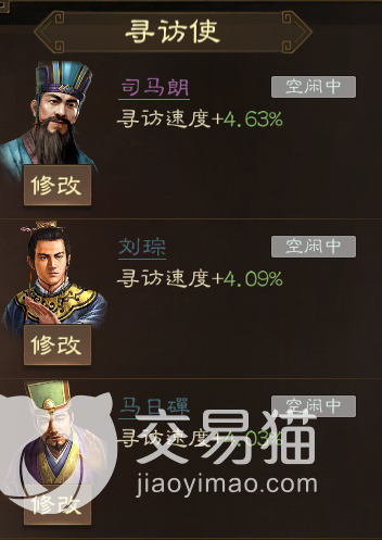 这一套这主要是侧重于资源与武将本身,首先司马朗对于预备兵那边的资源节省就不必多说了,重点是韩馥,他本身是一张蓝卡,相对来说会比较容易获得,而且其战法可以直接在寻访时提升多达62%的额外资源产量,对于比较依靠寻访来补给资源的朋友他会是一个非常好的寻访使搭配人选。另外许靖则是可以增加额外寻得一位武将的概率,如此一来,缺少武将的朋友也多了一份招揽新武将的机会。