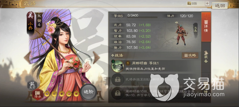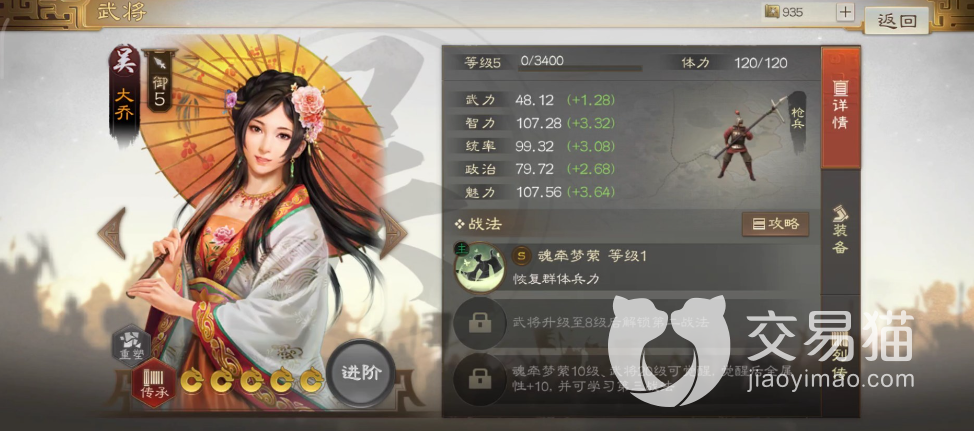 大乔在游戏中属于一个偏辅助性的角色,虽然她的武力值只有48点,但是智力和魅力都很高。而大乔的战法“魂牵梦绕”则可以回复群体的兵力,这样对于战斗的局势是有在逆转局势的作用。因此在队伍中存在治疗武将的情况下玩家可以选择与孙策、太史慈、周瑜和小乔进行阵容搭配。