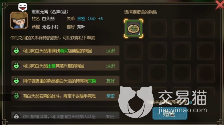 等这个好感值达到一定指标的时候,便可以将其邀请到自己队伍里了,那么送礼自然是要给对方喜欢的东西才行了,就比如在无名村里的白头翁,它喜欢的东西就是茶叶,那么大家要送他的东西也就是这个了。