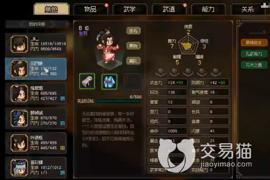 而有时候各位要是能触发与其有关的任务也可以将其直接招揽到队伍里,在对方进入队伍之后,便可以在角色面板中看到它的详细信息。在这里也可以送对方东西或者是购买些什么,同时此处还会有个选项就是离队。