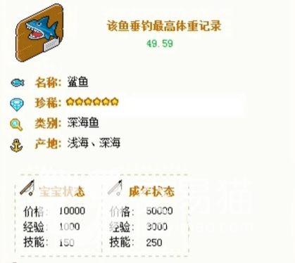它的是一个很稀有的材料,如果进行出售的话,可以获取到不少金钱,而不同大小的鲨鱼可以出售的价格和能够获取到经验值都是不一样的,其中成年形态的可以卖出的价格为五万,从此处能够获取到经验是三千。
