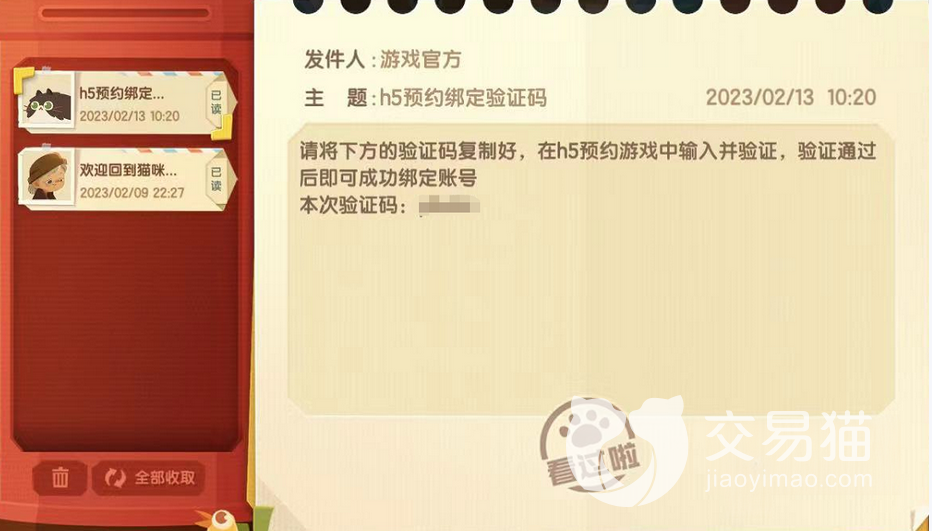 信件里面会有相关的绑定信息,还有需要输入的验证码。在完成以上的操作之后,我们就可以开始定制猫猫,选择自己想要的花纹和底色,然后对五官进行选择。确认之后,大家就能够在邮件中受到自己猫猫定制成功的消息。领取完成之后,就能够直接使用了。