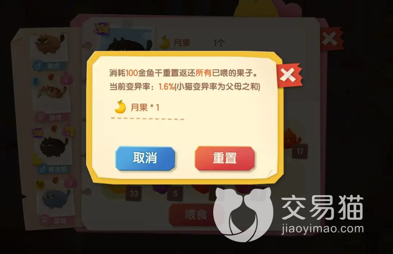 在结合的过程中,喂养变异果是非常重要的。本身想要获得变异猫的概率就只有1%,喂多一个变异果就能够增加0.6%,在喂满50个之后,概率自然也就上升到62%,这个也算是一个很高的概率。品质方面大家无需担忧,只要你的公猫和母猫自身的品质本来就挺高的话,基本上出生的变异猫品质也会高的。