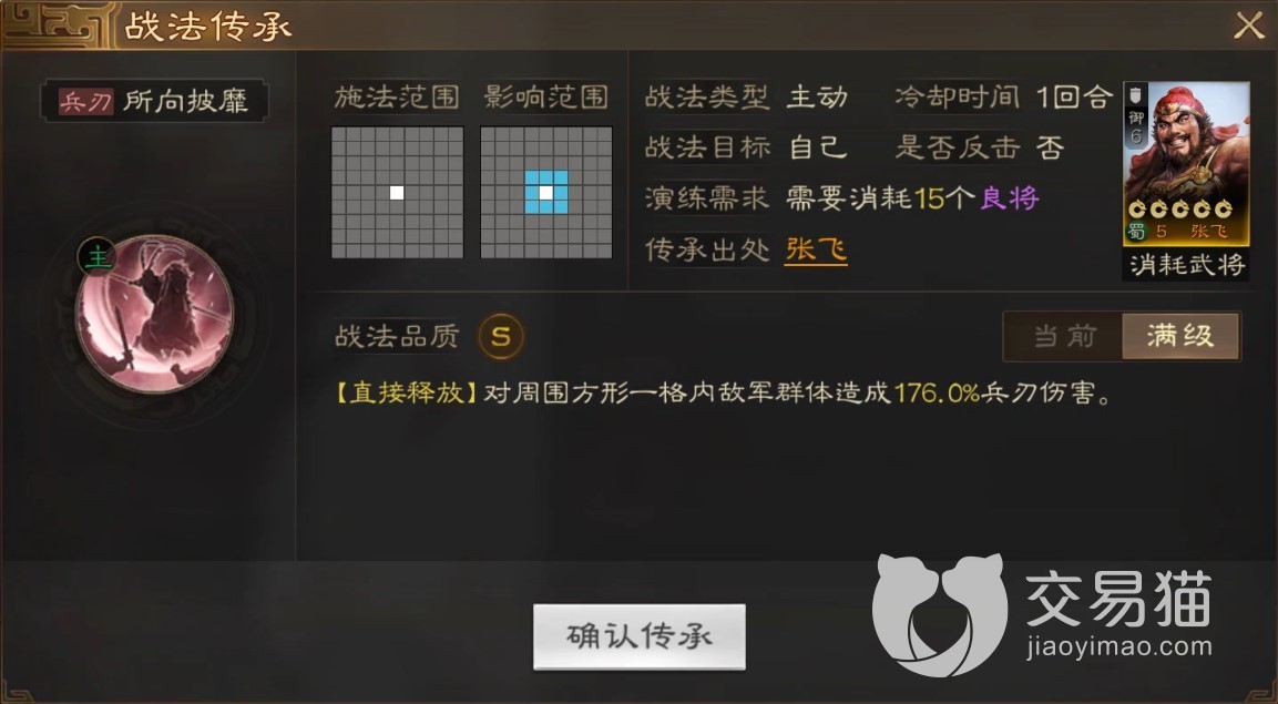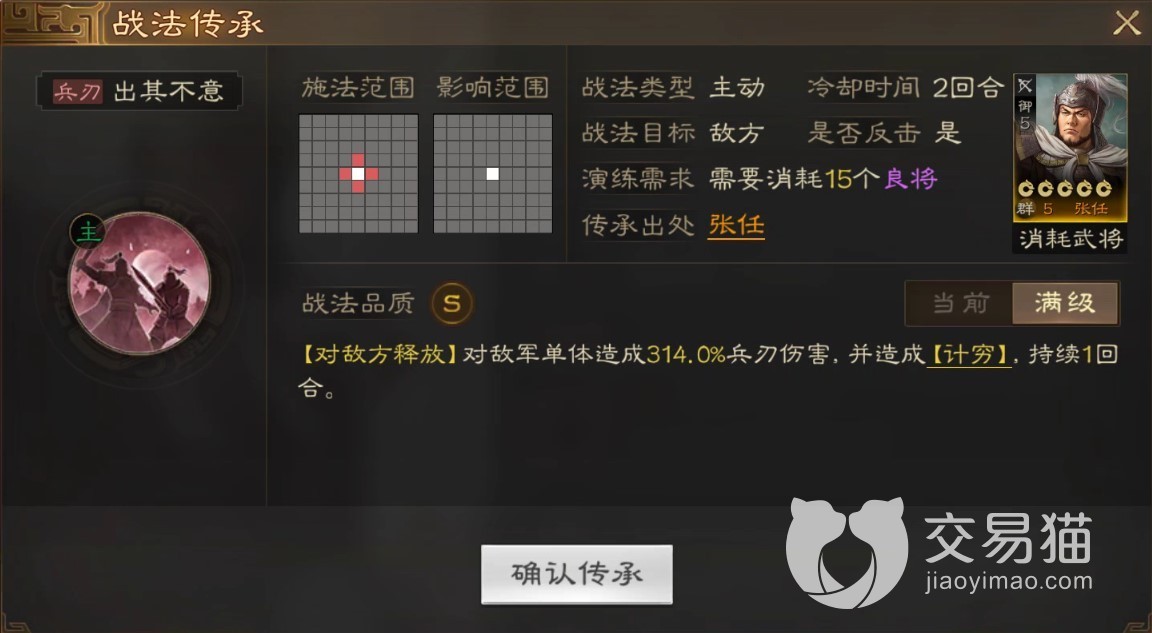 传承战法是在突击造成主动单体伤害后附加额外的伤害并有流血的效果,传承战法的效果还不错如果有多余的也可以给自己用。再搭配上张飞的“所向披靡”增加一些群攻输出,或者直接把单体输出拉满用张任的“出其不意”,高额伤害加技穷。