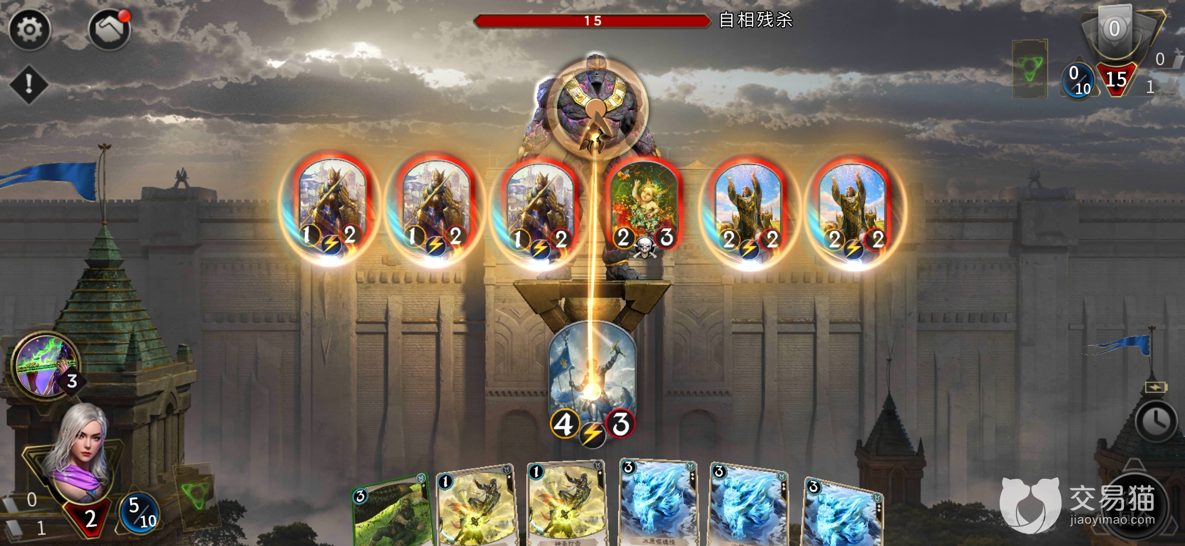 下面点击左边的神器拿到法力值,再重复上述操作:吞噬圣女后用1费解放圣女、打怪,整套操作下来15点伤害,怪死,残局迎刃而解。“自相残杀”局主要是用吞噬再释放反复刷新敏捷,好让圣女一直行动。