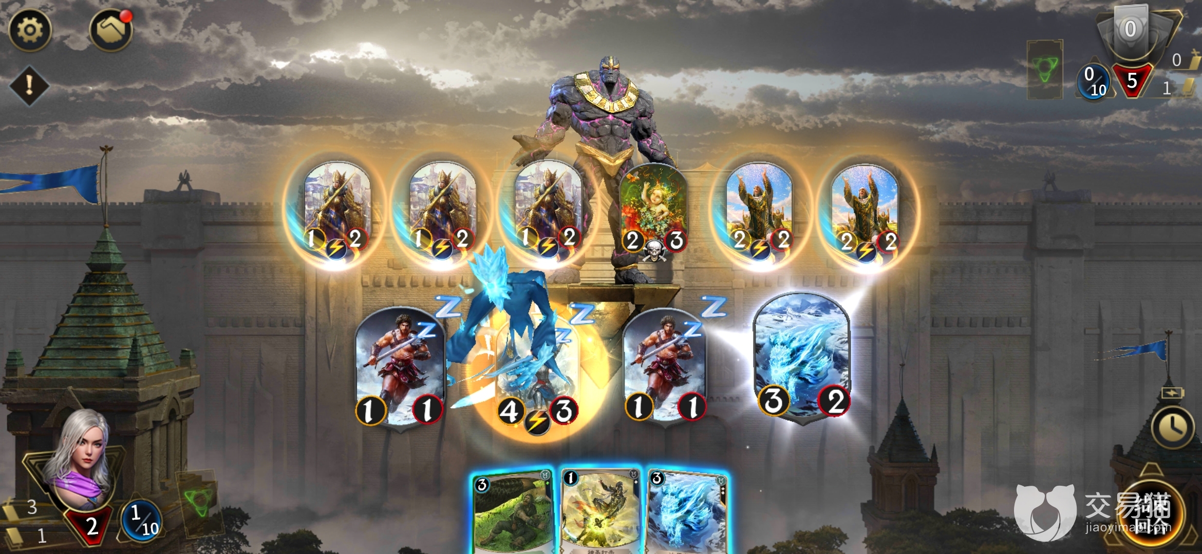 开局先用5费圣女冲对方大怪,由圣女召唤出的小兵也去打怪。之后用3费的冰原吞噬怪吞掉5费圣女,接着用1费的神圣打击再破坏吞噬怪的效果,解放出圣女。这时候圣女刷新敏捷,打脸,再释放小兵,小兵同样打脸,此时的怪已经快招架不住了。