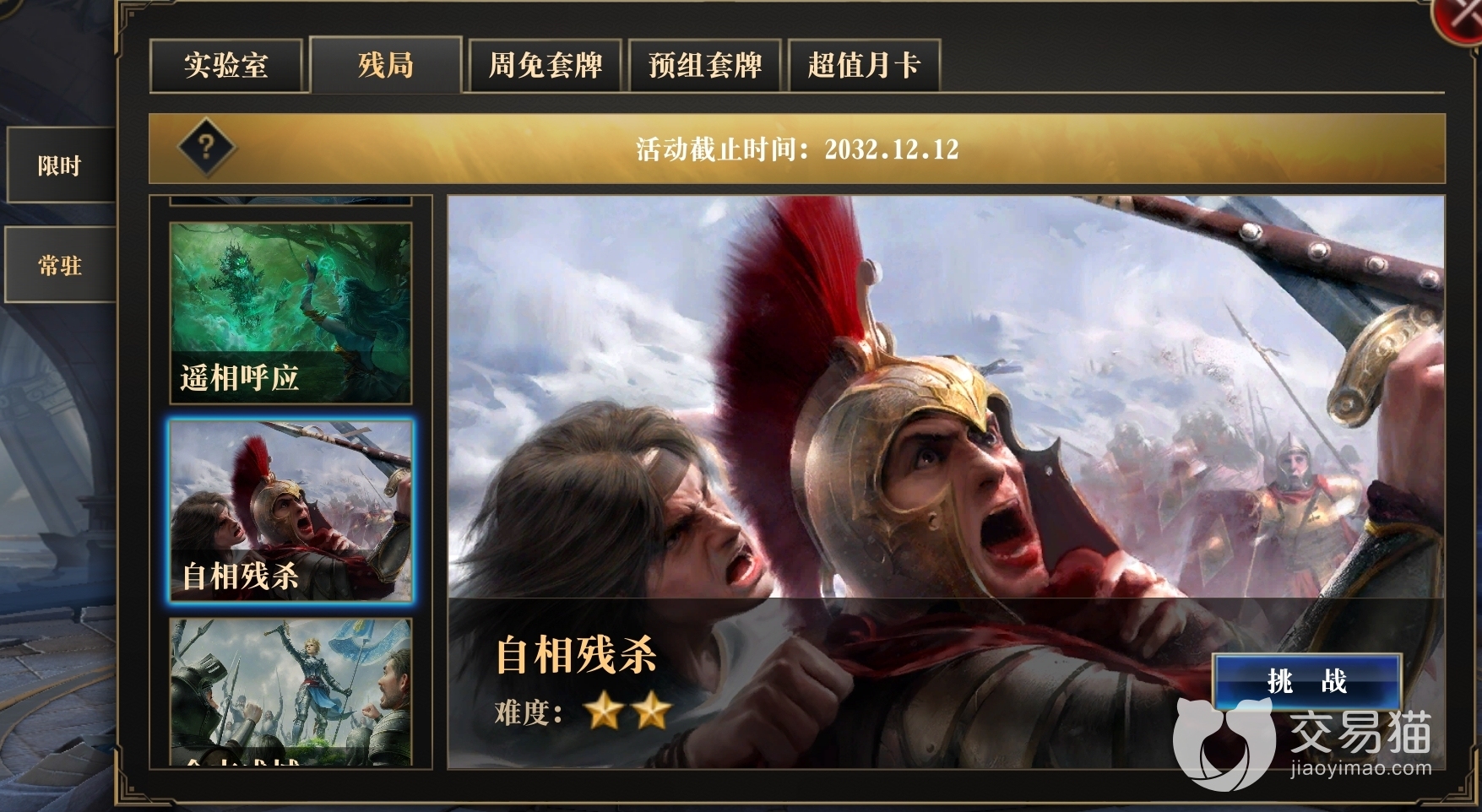 在活动——常驻——残局中有11关,自相残杀是其中第九关,关卡中已经给定了固定的卡牌组合,没有看破题眼的话是真的过不了。谜底就在谜面上,玩家过关的关键就在于“自相残杀”,接下来小编说一下具体如何行动。