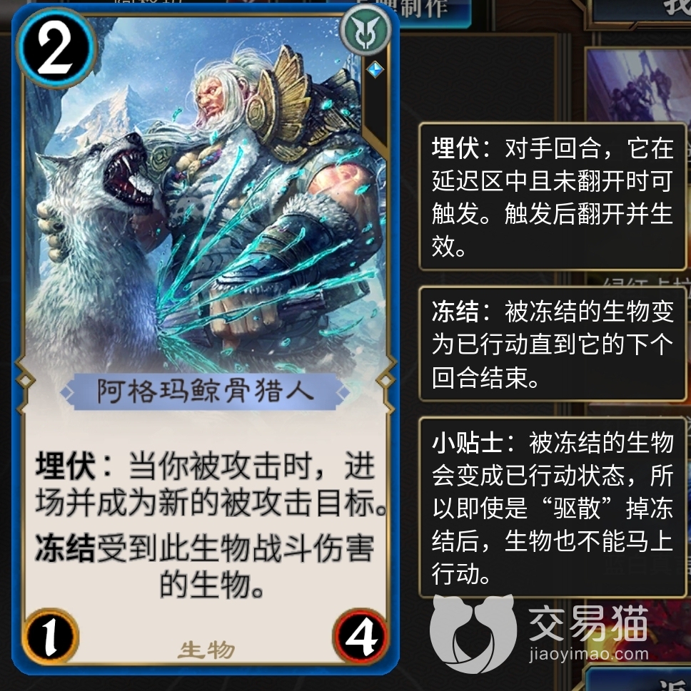 3费“碎星锤”和3费“寒冰吐息”过牌、冰冻。“阿格玛鲸骨猎人”3费,具备“埋伏”效果,保护己方血量,同时有冻结效果,能抵消掉帷幕效果,保障己方的控制权。“冰沼水灵”冻结控场,可与“骤霜”打配合。