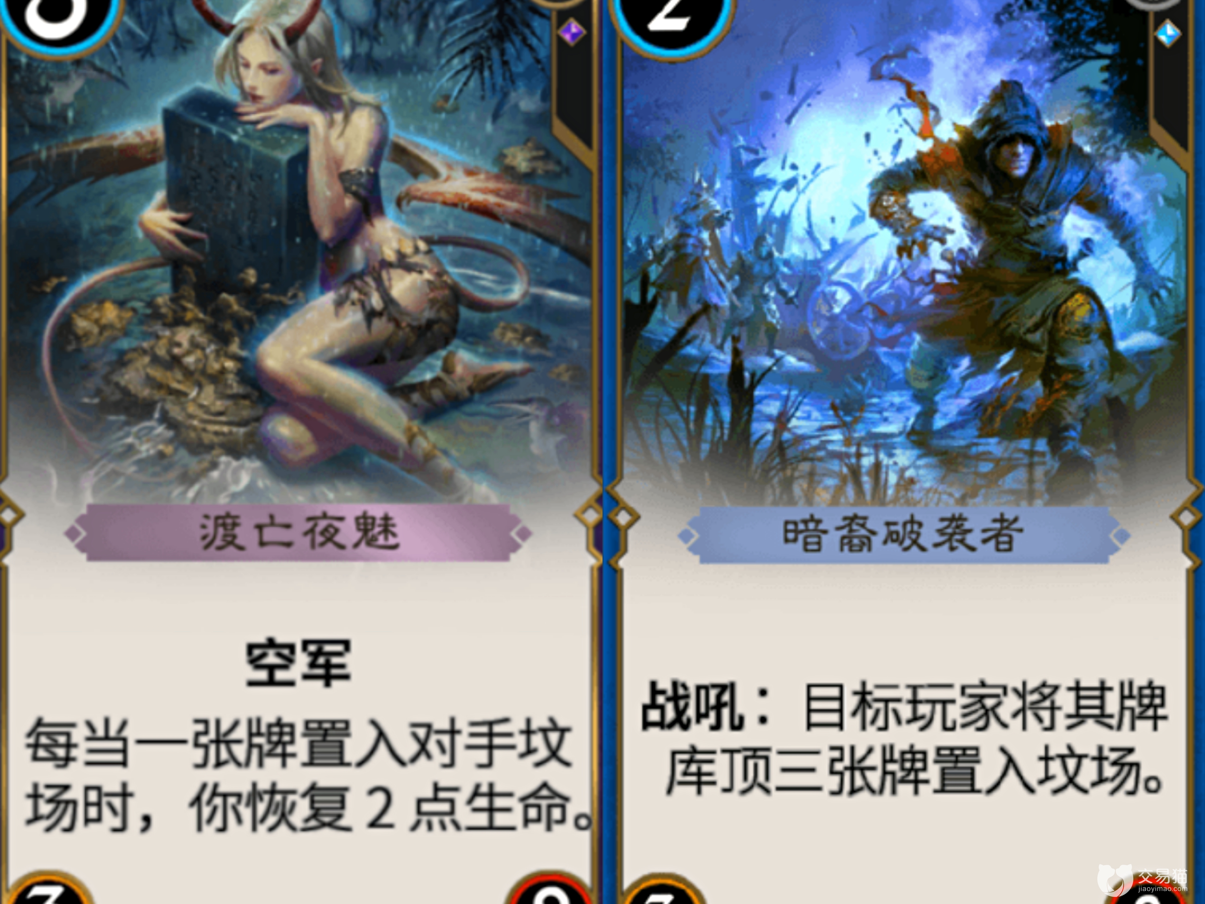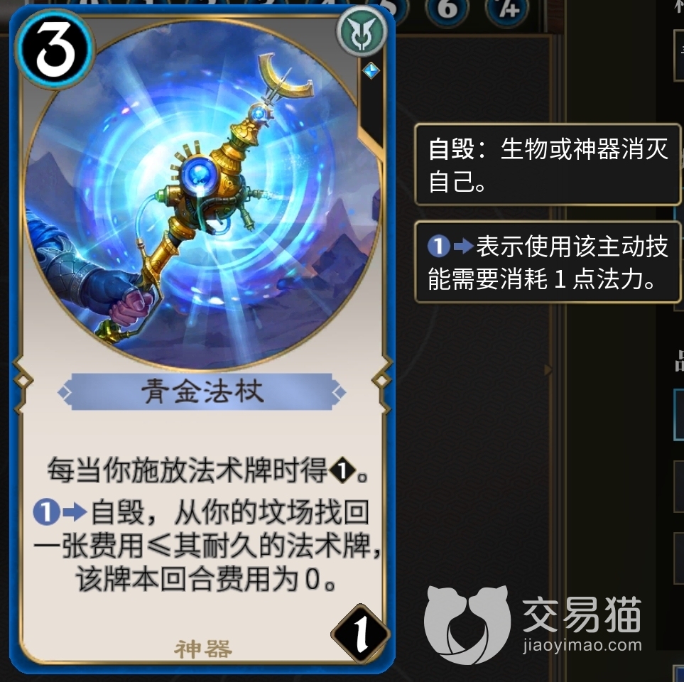 3费“闪现泰马哈”放入延迟后使回手的卡牌减3费,使卡组富有灵活性。3费“复诵”在此卡组中主要用来复制“驳回”“骤霜”以及“暗裔破袭者”。3费“青金法杖”当你施放法术牌时增加1耐久,花1费可从己方坟场中回收法术牌。