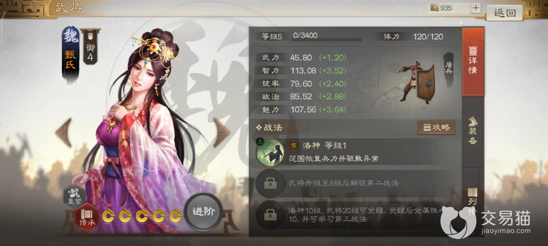 游戏里的甄姬统率盾兵,智力与魅力值极高,统率值(兵力)方面则是紫卡水准,但也够用了。战法是群疗加驱散,非常管用的治疗技能。传承技能可以提升治疗效果并附加一层每回合持续治疗的buff,对单则是2层。该战法与甄姬自身的也很契合所以如果有2张甄姬可以拆1个给自己用。