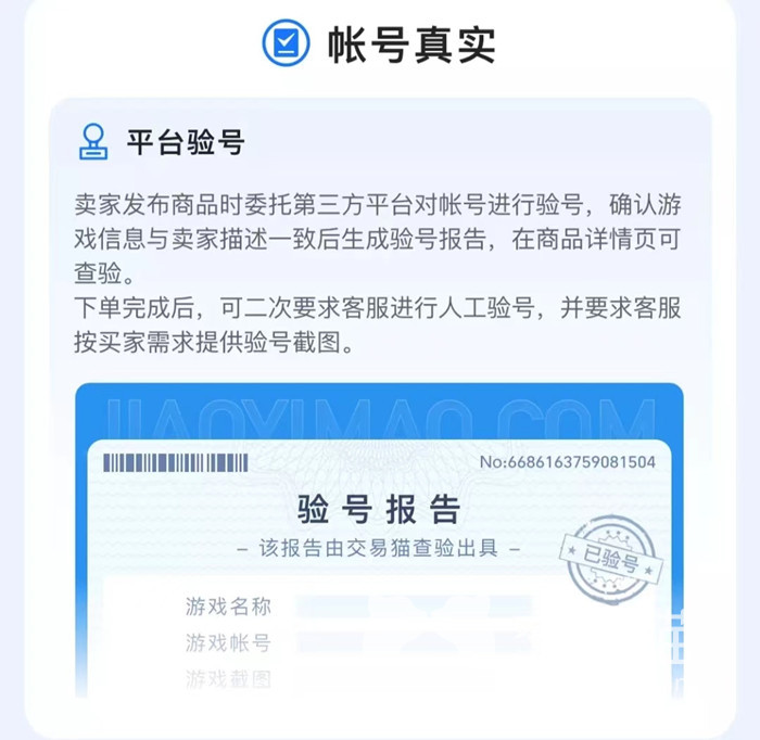 对于卖家来说账号是否真实直接决定了后续能否在平台继续混下去,所以交易猫为商家提供了可选的平台验号服务。绝大多数真心实意卖账号的玩家应该都非常乐意选择这个服务,毕竟选择后订单详情页中就会多出一个由官方出具的验号报告,对消费者来说这可谓是一剂强心针,会让一个本来徘徊不定的消费者快速下定决心。