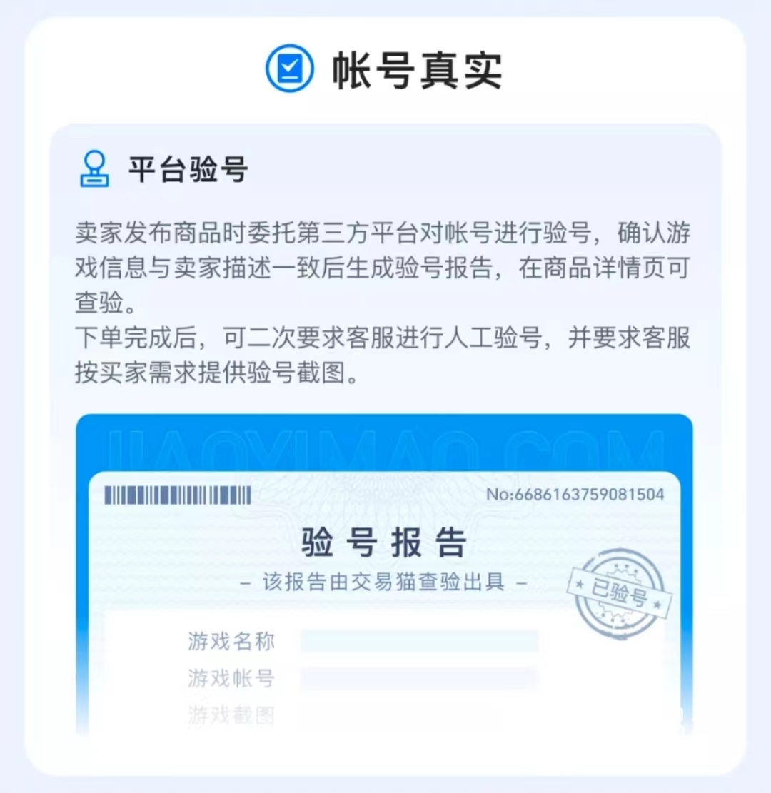 交易猫商品数量庞大,各种各样的账号不在少数,交易猫可以满足大部分玩家的买号需求,比如你看中了一个剑与家园的账号,并且这个账号的详情页显示了验号的标志,那就说明商品详情页信息与账号真实信息一致,你可以进一步考虑购买这个账号,不用担心对方虚假宣传的问题。