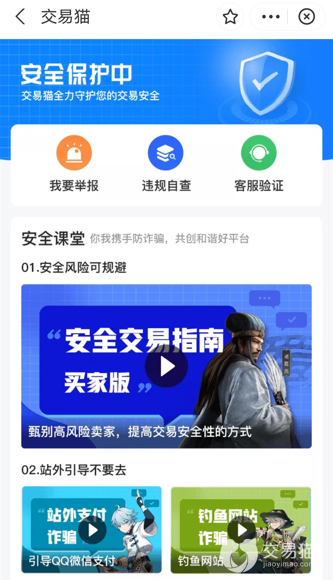 另外,交易猫也非常希望玩家们能够拥有比较警惕的安全意识,所以在平台设有专门的安全课堂,小编建议只要是在平台进行交易的玩家一定要认真学习安全课堂的内容,它可以很好的告诉我们怎样可以尽可能规避掉一些危险因素;并且如果你在平台发现了对方有安全方面的隐患,或者已经被骗,那么也可以在平台进行举报。