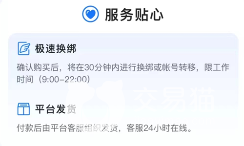 并且该平台表现出的优势不仅仅是体现在此处,同时像极速换绑服务,大家也是可以去选择的,并且整个交易的流程也会变得更加的快速,像平台发货以及客服验号等,也都能在玩家购买的过程中提供给大家,如此一来,成交的概率就能够大大的提高,同时也不用在担忧会出现被找回以及信息虚假的问题。