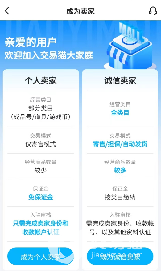 玩家如果在很多游戏的渠道服选择上,都选择了小米,那么各位在出售账号的过程当中,就需要考虑去选择一个支持该渠道服交易的平台才行。目前值得各位去体验的交易猫app中,就会合理的帮助玩家解决这一问题。并且,平台也会面向所有人开放两种不同的卖家身份申请。