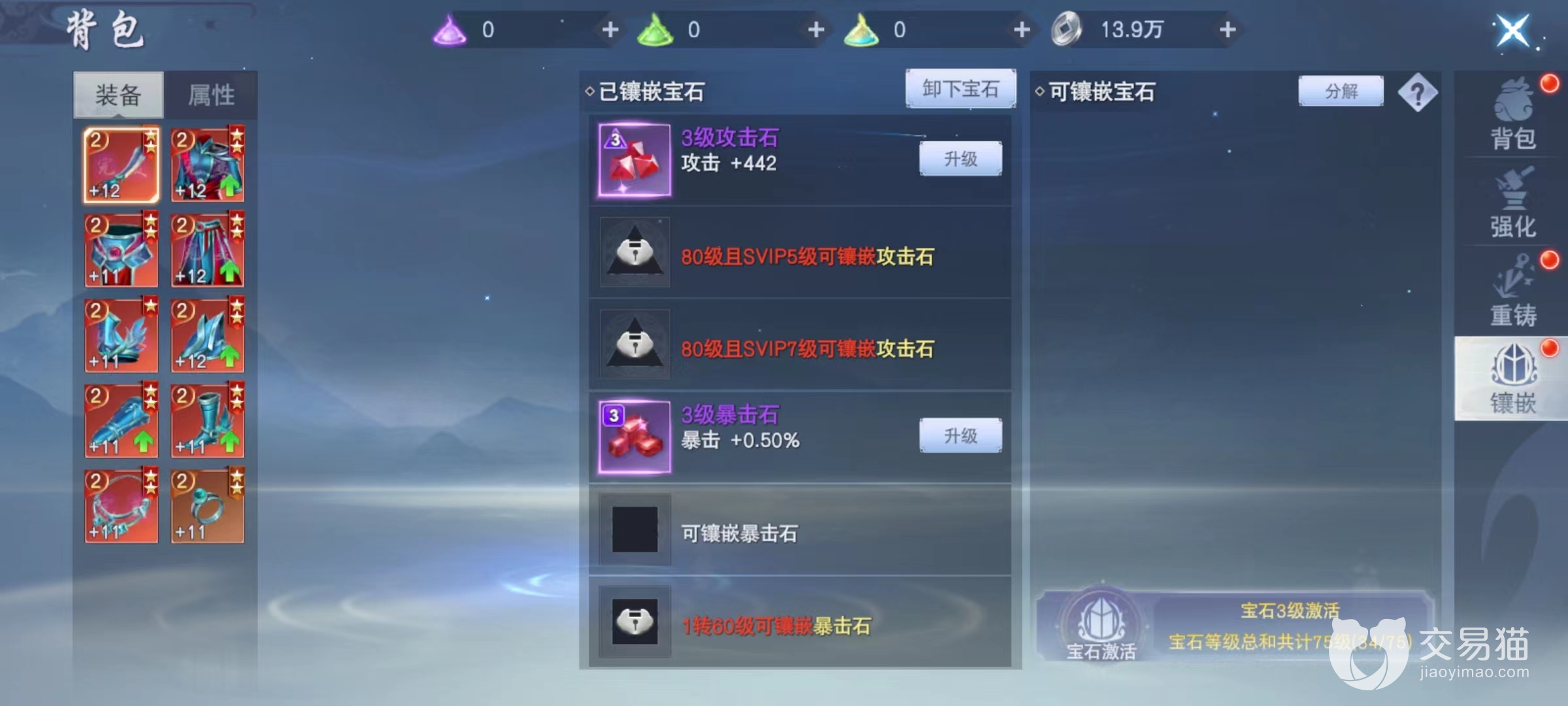 接下来是重铸,重铸让装备主要属性变得更高达到完美,重铸需要消耗重铸石以及其他同品质装备提高成功率。重铸完之后接下来镶嵌宝石,每个位置装备最多可以镶嵌6颗宝石,但是需要不断提高VIP等级和装备等级才能逐步开放。宝石属性有暴击,攻击,防御护甲等不同类型,根据装备需求进行合适选择。红颜属于游戏中比较有创意的设定,类似于伙伴,同时只能出战1位红颜。根据自身需求和实际情况进行选择,有些擅长输出能够造成高额伤害,适合在和首领怪物对战时选择,有些则可以添加护盾,如果感觉自身防御比较低,可以通过伙伴弥补。