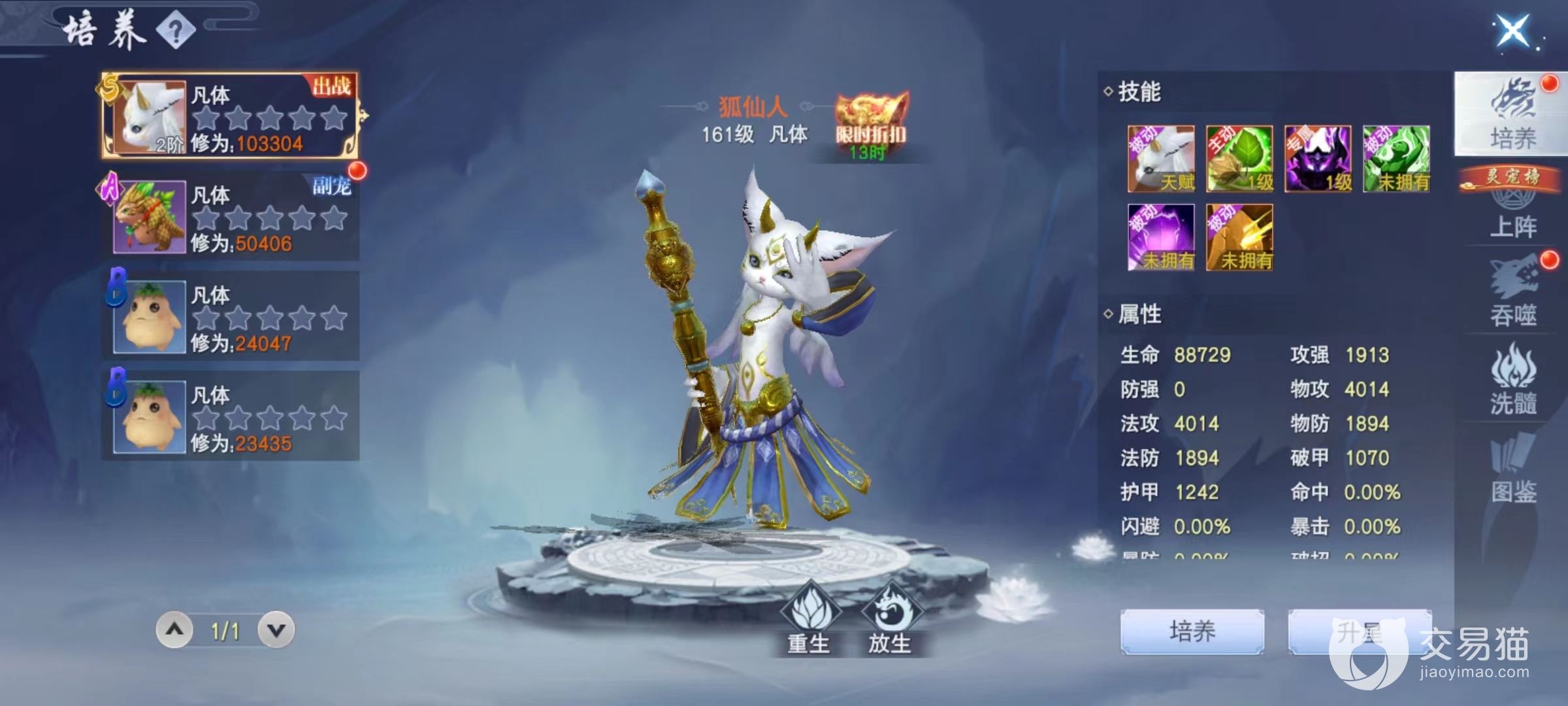 初期只能获得a级,后面利用各种道具最多能获得SS评价。红颜除了出战之外,还有助战,装扮和羁绊等系列玩法也是游戏中非常重要的系统。灵宠系统同样属于出战类型,选择品级资质最高的作为主要出战,还有三个可以作为副宠和备用,同样能将属性加成到主角身上。培养灵宠比较复杂,除了升星和提升等级之外,通过不断吞噬其他灵宠提高属性,然后解锁更多技能。前期不建议将资源投入到这里,后期才是宠物发威的时候。