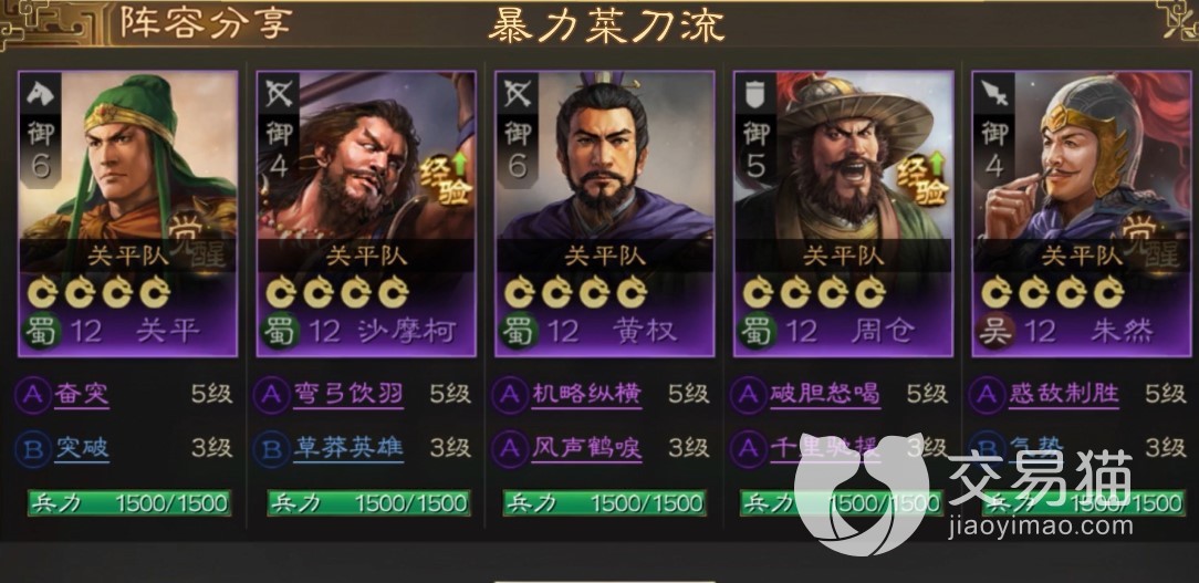 开荒队用得最多的就是菜刀流,全队5个都是输出,推荐关平、黄权、沙摩柯、周仓、朱然,这套阵容对配置的需求不高,合计下来只要25点的统御值,主城到了3级就能满配,不必担心御值不够导致无法使用。战法这块关平带“突破”,能对攻击目标左右两侧造成伤害,群伤明显。黄权带“风声鹤唳”范围谋略伤害,沙摩柯带“草莽英雄”,伤害外加减防减智。周仓带“千里驰援”,给队友挡伤害,有再动和提高统率值的效果。朱然携带“气势”降低周围敌军的防御,加起来技能有3蓝2紫,第一天获取并不难。如果有招到属性更好的武将,技能合适也可以直接替换,例如说关平可以用更好的马超来代替,黄泉换成周瑜,沙漠和换成黄忠或者严颜,周仓换成张飞,朱然用法正替代。即便没有橙卡,这些紫卡也是很好使的。