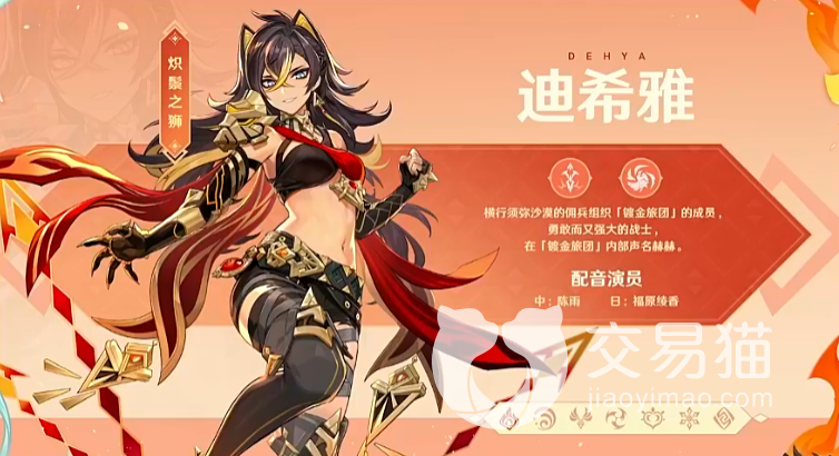 迪希雅的角色四字称号是炽鬃之狮,全身的配色黑金红三色,金色以铠甲为主,色调搭配还是比较华丽的,作为火元素角色,迪希雅使用的是双手大剑。新版本将随之推出新的双手大剑苇海信标,在前瞻中也由迪希雅手持,估计属性上可以作为专武来看待。