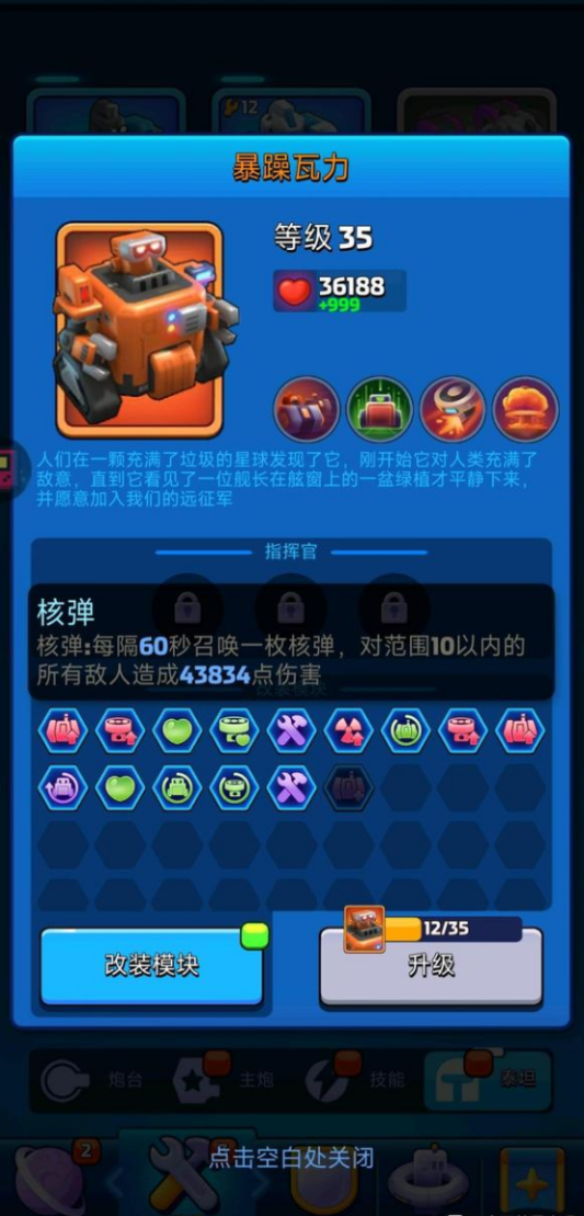 暴躁瓦力是什么,它是非常厉害的橙色泰坦,在三种泰坦里面,属于不那么氪金就可以拿到的武器,购买礼包之后,会有选项可以买下,如果不小心错过也没有关系,等一等商店上架。后续有条件在对瓦力进行模块改装,橙色泰坦培养起来还是比较费时费力的,如果没有氪金改装,后期还是炮台伤害高,玩家们综合考虑哈。