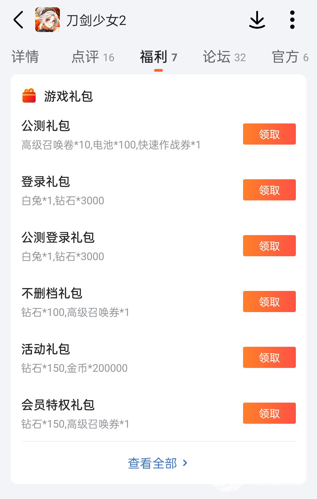 大家可以在该游戏的专区页右侧礼包栏目中查看当前可以领取的礼包。如果你觉得这样比较麻烦的话也可以直接下载九游APP,在该游戏的专题页中找到福利一栏,同样可以看到目前上架的那几款礼包。