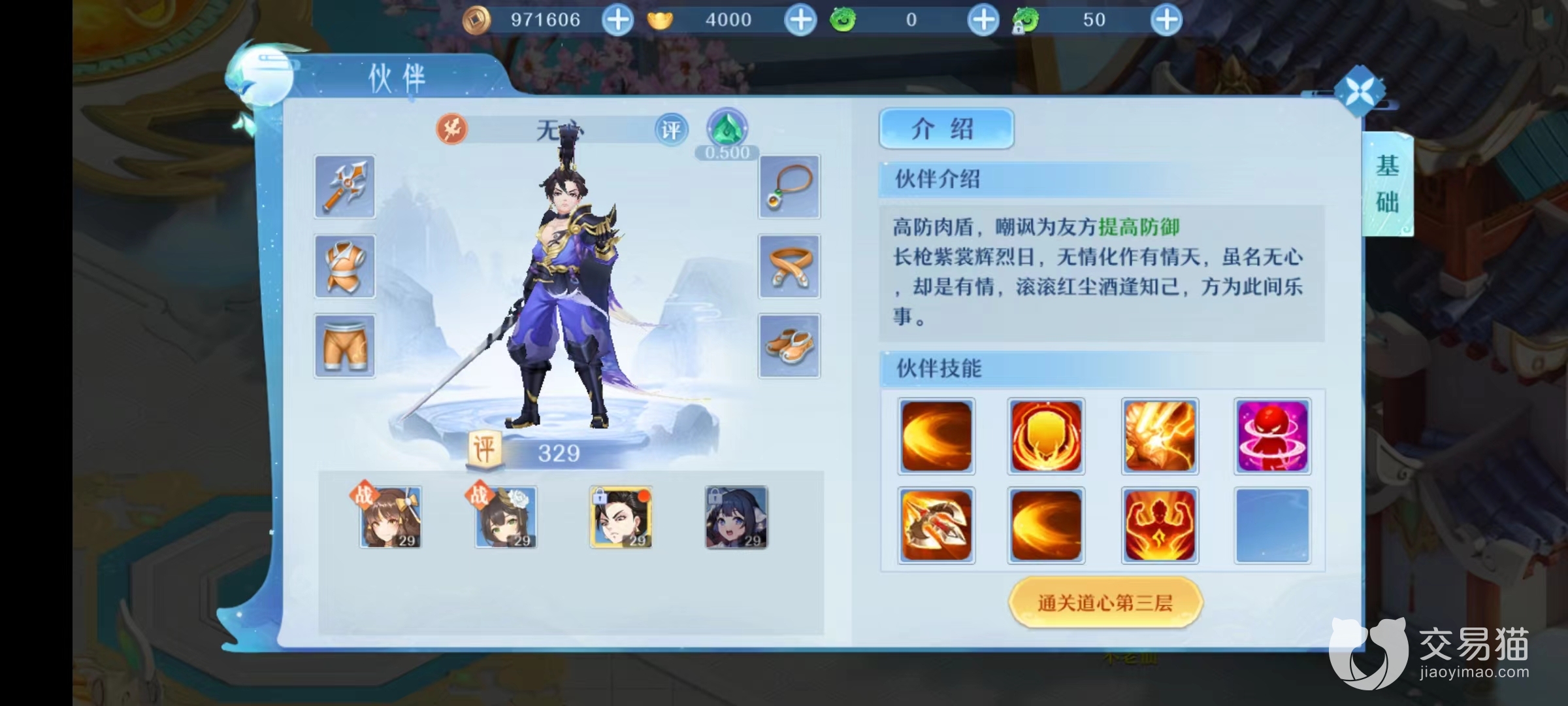无心是一个很好的肉盾,虽然在输出上低一些,不过技能在攻击之后能够嘲讽对方,让目标强制攻击自身,同时能提升物理防御属性。还能通过真元护体获得一个护盾,给自己施加也可以给其他队友,这样既提高自身生存又能保护团队。再加上拥有一定控制力,让对方单体有几率陷入到混乱状态。这样组合起来各个位置非常全面。