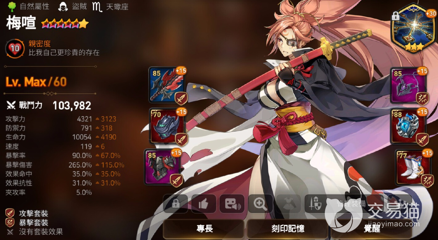 2、这个角色最大的一个好处就是,对装备的要求相较于其他角色来说是要小很多的。任如果不是为了追去极限的输出,那么他的攻击在有3700以上的=时候,就能稳定完成讨伐13了。即使是在没有好套装的情况下,那么适当提升一下暴击和攻击,也是勉强能过得去的