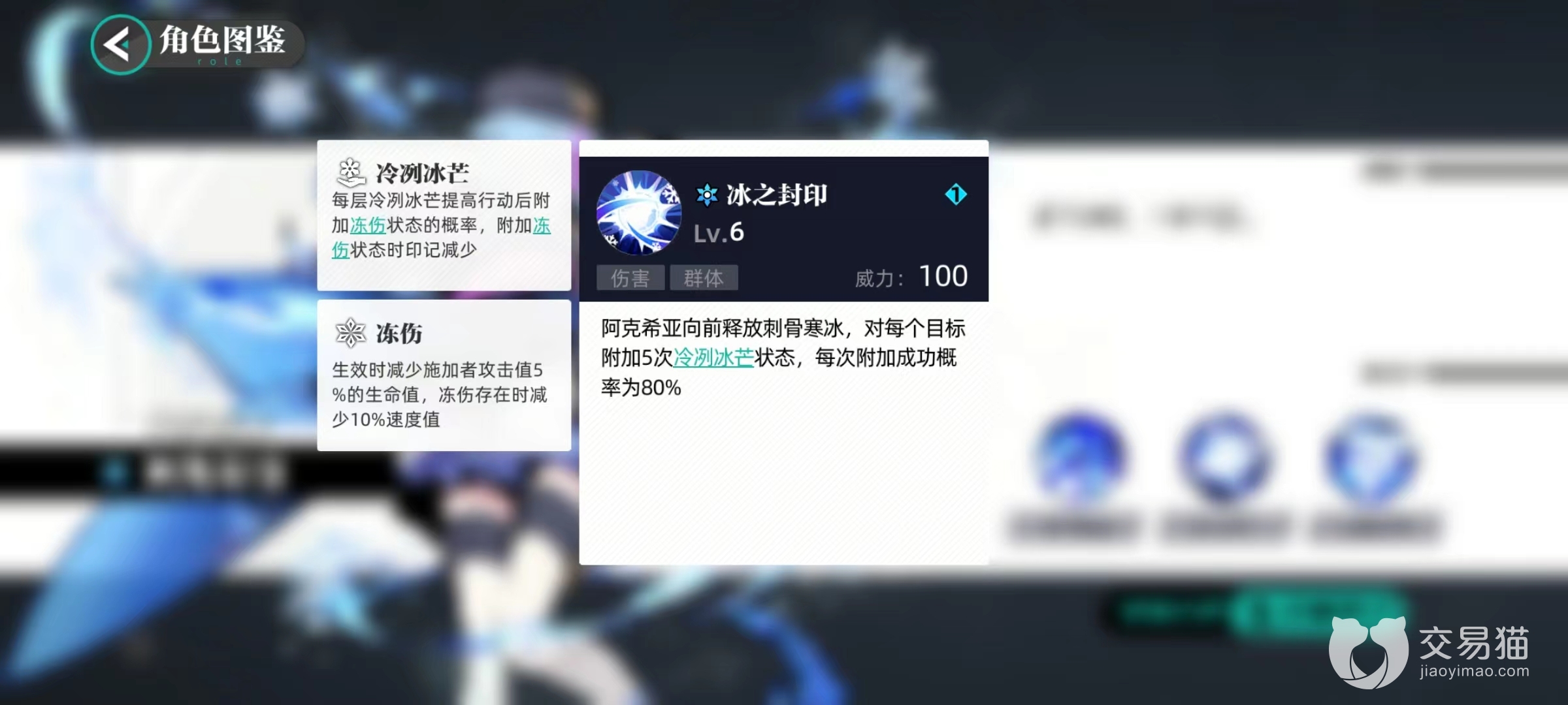被冻伤目标速度降低,还会继续造成少量生命值损伤,冷冽冰芒则是提高对方被附加冻伤几率。而且冷冽冰芒是阿克希亚主要状态效果之一,也为对阵容搭配时选择队友指明了方向,堪称是看家本领。第2个技能为群体伤害类型的冰之封印,向前方释放出寒冰,对所接触到的每一个敌方目标都附加冷冽冰芒状态,提高接下来受到冻伤几率。