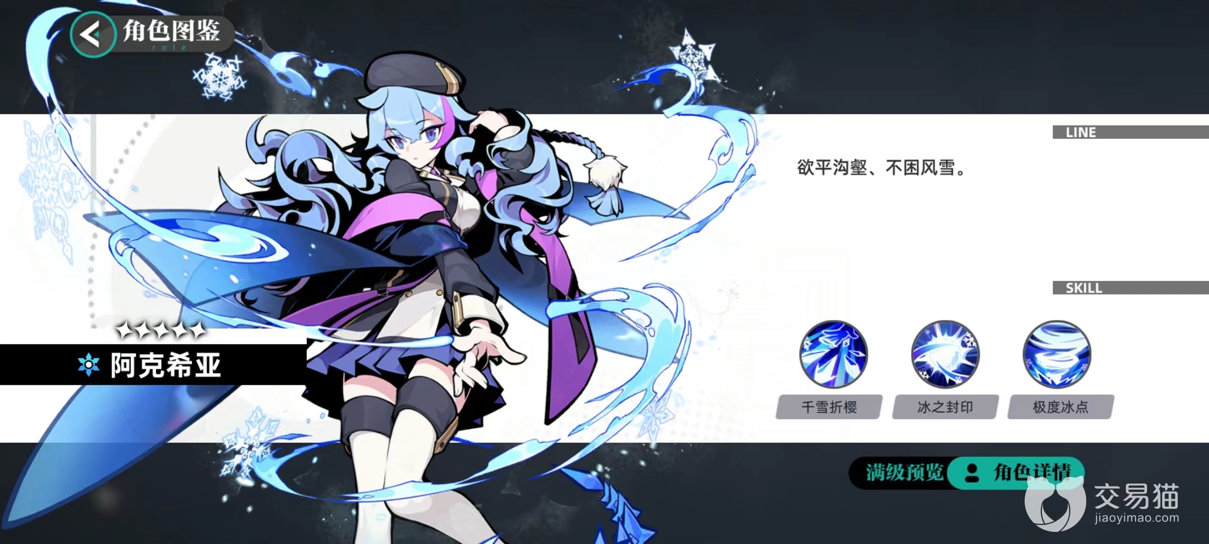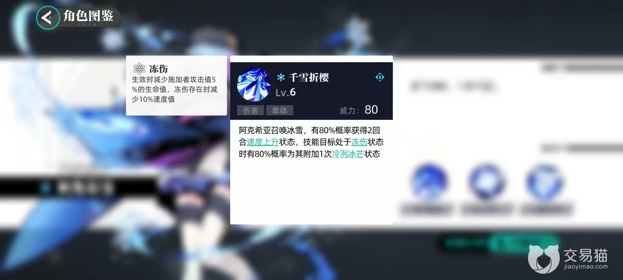 阿克希亚三个技能能够带来非常丰富的状态效果,第1个技能千雪折樱,是单体伤害类型,召唤冰雪攻击对方目标后,有极大几率使自身获得速度上升状态,如果技能伤害目标正处于冻伤状态,则该技能有几率为其附加一次冷冽冰芒。这一个技能就包含有多个不同效果,需要一一解释,速度上升状态提高自身速度值,方便接下来更快出手。