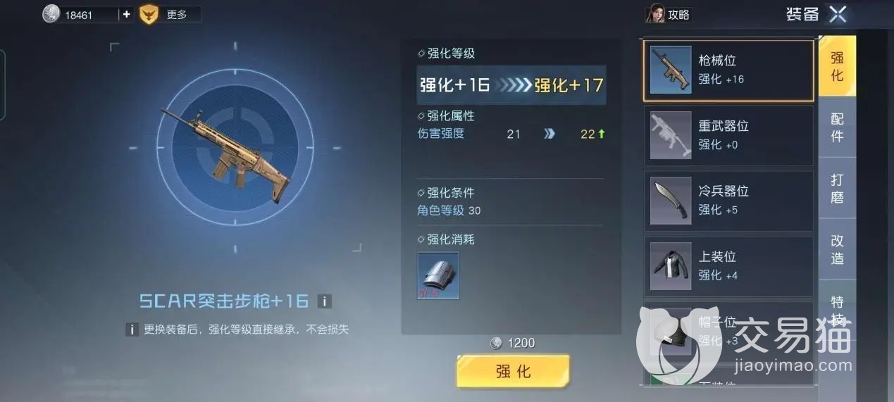 强化就是常规认知下的增加伤害强度,强化级别会显示在武器名字后面,比如图中的scar突击步枪就加到了16,每次强化会消耗材料以及银币,等级高自然消耗也大,好在强化等级后在换武器后可以继承,这个极度良心了。