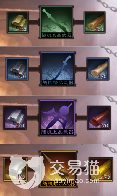 其中良品类的矿类材料按品质等级从低到高分别为“青铜”,“铁”,“精钢”和“百炼钢”这四种,矿类材料它主要还是在武器和防具这两种装备上使用的最多,其中品质越低消耗的材料数量则越少,从最低的青铜到最高的百炼钢它们消耗的数量分别为2,3,5,8。