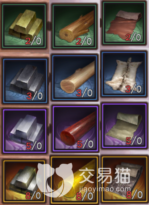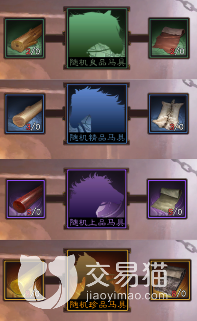皮革的使用数量也是按品质划分的,锻造马具时也会用到,所消耗数量仍然是2,3,5,8。另外马具锻造还会用到和武器一样的木材,它们分别为拓木,白蜡木,紫檀木和金丝楠木。