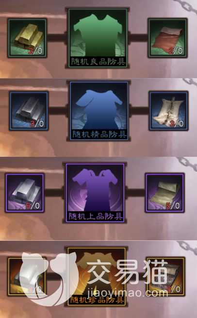 然后防具本身还会消耗一些皮革,皮革材料根据品质从低到高分别有“牛皮”,“狼皮”,“兕牛皮”,“苍蛟皮”这四种,这些皮革和之前的铁矿都可通过商店兑换,世界探索,寻访以及讨伐辎重队和蛮族首领获得。