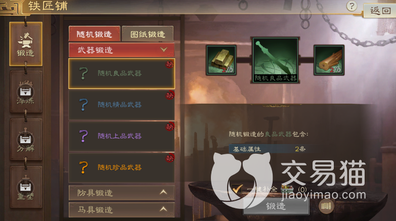 在进行武器、防具、马具的锻造的时候,需要玩家消耗多种材料,品质不同的话,需要消耗的材料也会有很大的差异,如果没有专属的装备图纸进行锻造的话,那么玩家锻造出来的装备就是随机品质的装备,即便是有图纸的情况之下,能够锻造出来的装备品质也是随机的,数值越高,品质才会越高。