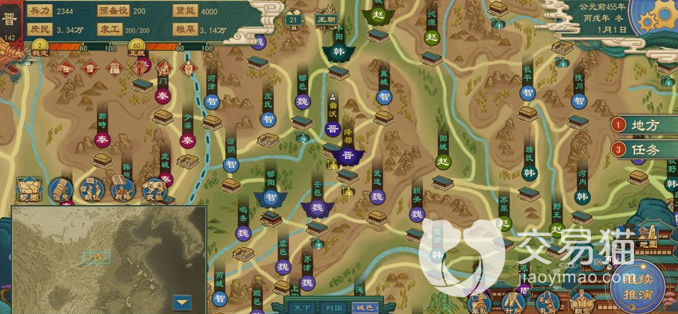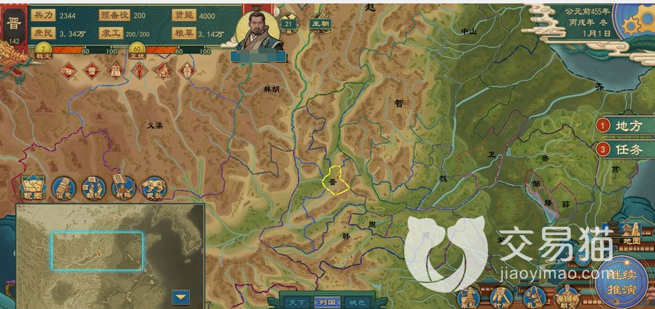 首先游戏开始后需要选择难度,这里建议大家是先从简单开始,先熟悉,游戏中途是可以改变难度的,等到适应了之后在改变难度即可,不想改变的话一直用这个难度玩下去也行,在选择完难度之后游戏正式开始,晋国的初始位置在智国和中山国的附近,游戏的第一步就是拿下他们两过,具体步骤如下。