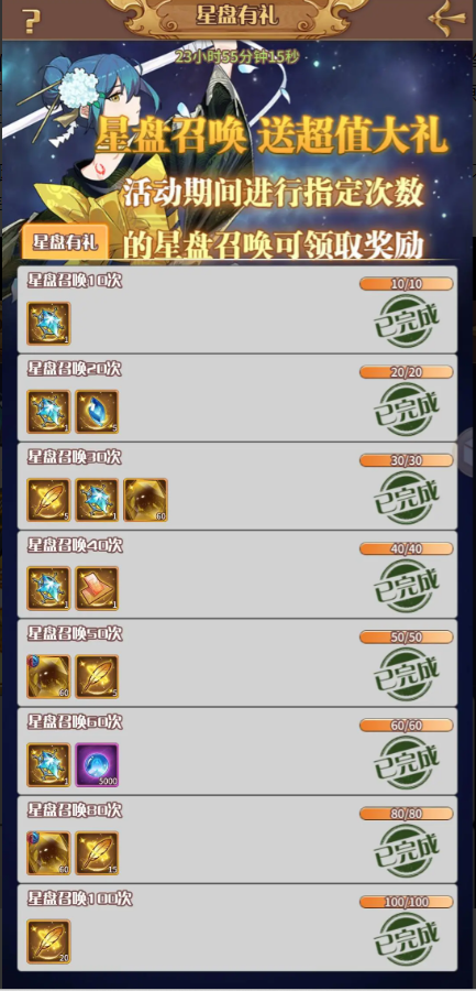 另外,由于游戏会时不时的出现召唤活动,所以眼泪方面暂时不用攒,因为会给很多,到时候活动完成之后,应该能全部做完。星盘方面也平时不要随便乱抽,最好等到活动的时候一起使用,到时候会额外获得很多羽毛。