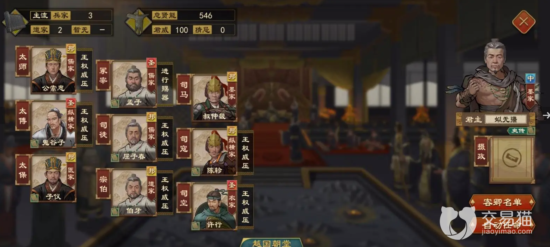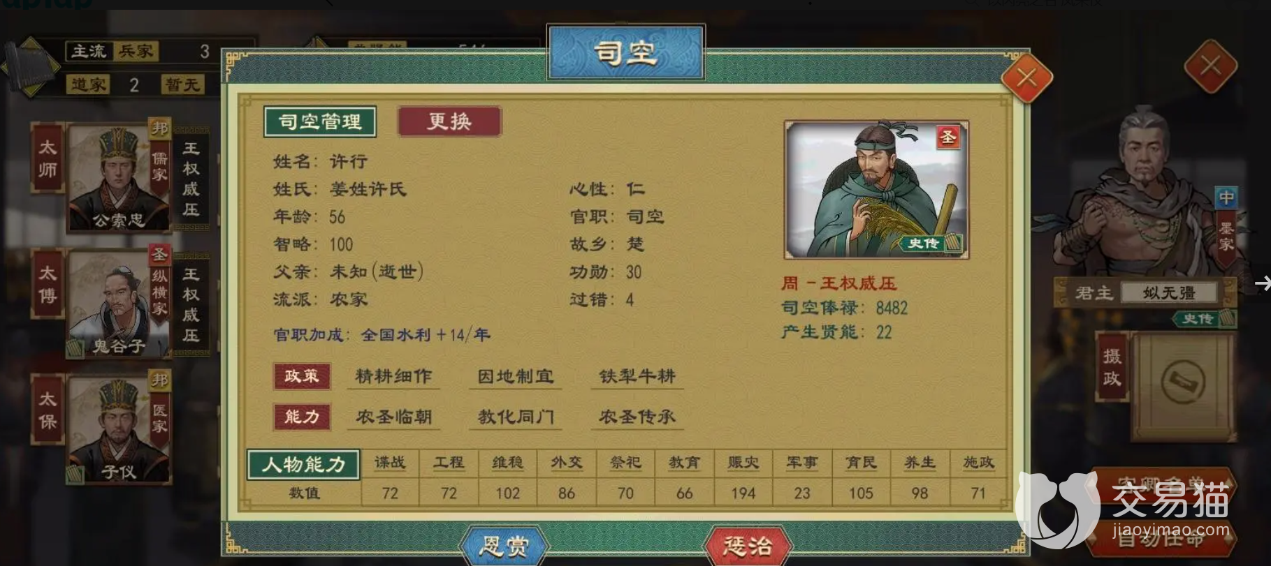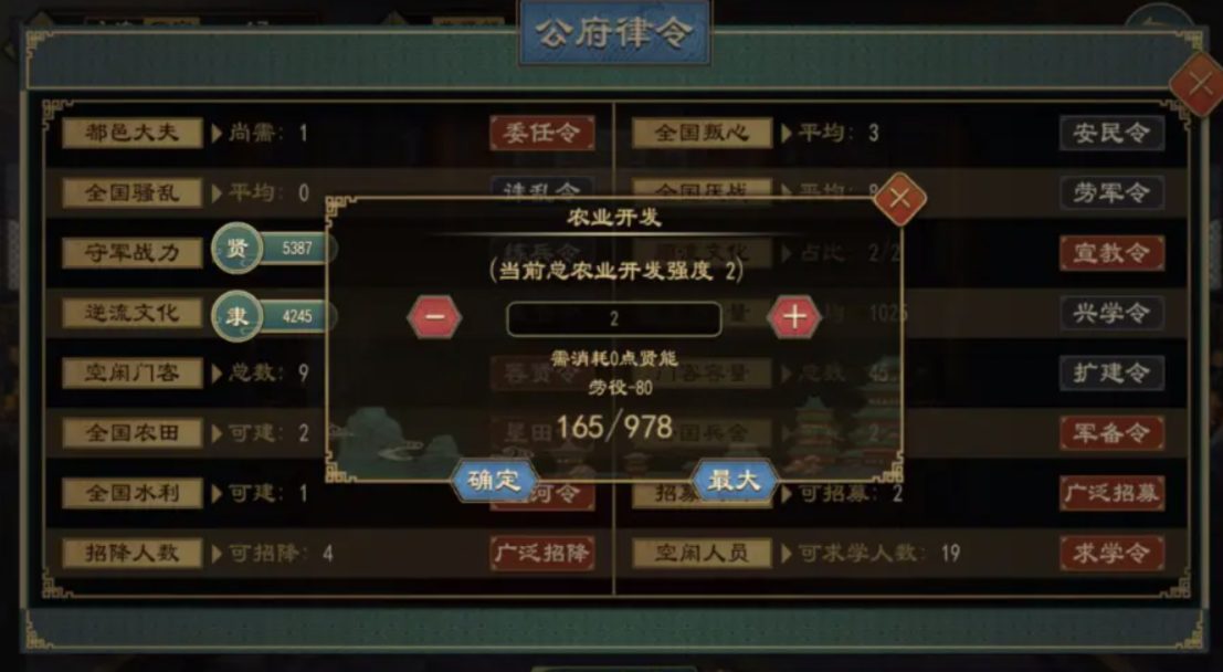 最后游戏里面的角色也是非常重要的,表现在游戏里面的大臣招募,在非常缺粮的时候一个农家的名士可以解决不少的问题,时间一久你就会发现自己国富民强了。
