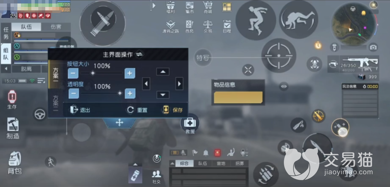 1、左边区域:首先大家先从左边开始进行设置,左边的这个玩法信息是没有用的,大家先给他放到一边去就行了。然后把射击按键全部给他拖到血条的右边位置。在完成上述操作后,将左下角这边的这个配方和背包给它放大一点点,方便开启使用。同样生存辅助仪和方向盘也给他放大。最后把召唤载具的按键给他拖到左边配方的旁边去,这样左边就已经设置完成了。