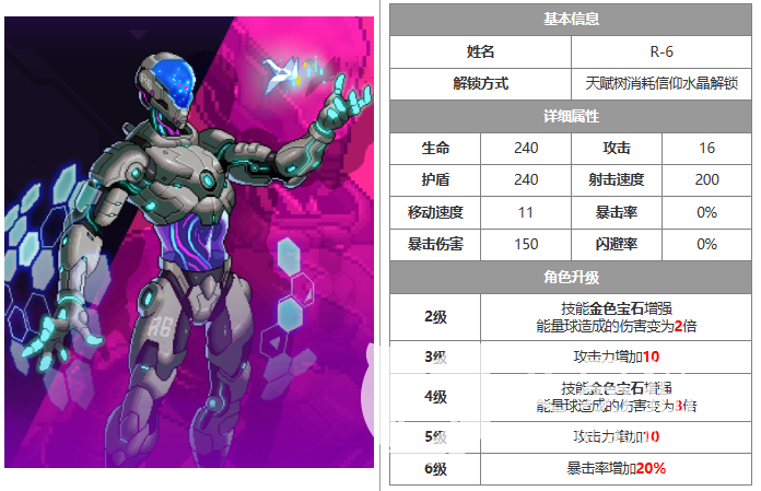 而r6作为一名机器人,玩家如果想要获得他就需要花点心思了,因为这个角色是能够白嫖的,也是白嫖角色中最厉害的,但是获取的难度就比较高,需要玩家将天赋树提升到一定的等级才能够解锁,而玩家想伙提升天赋树的等级就需要不停的去击杀boss。