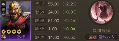 该武将作为谋士,其属性上很好的将智力进行了还原,作为盾兵辅助,其拥有非常不错的辅助能力,也能够在后期转型成为一个肉盾输出型武将,是泛用性非常的高,可以说是万金油级别的存在了,其自带战法不仅能够随机驱散一个异常状态,还能够为队友提供治疗,可以说是在华佗之下的一个强力奶妈了,治疗效果本身就非常的强,加上驱散异常效果的帮助,能够起到锦上添花的作用,光不谈治疗,驱散就是非常不错的战法了,如果想要提升其作用的话,最好加一个谋略输出的范围性伤害战法,让其兼顾输出与辅助。