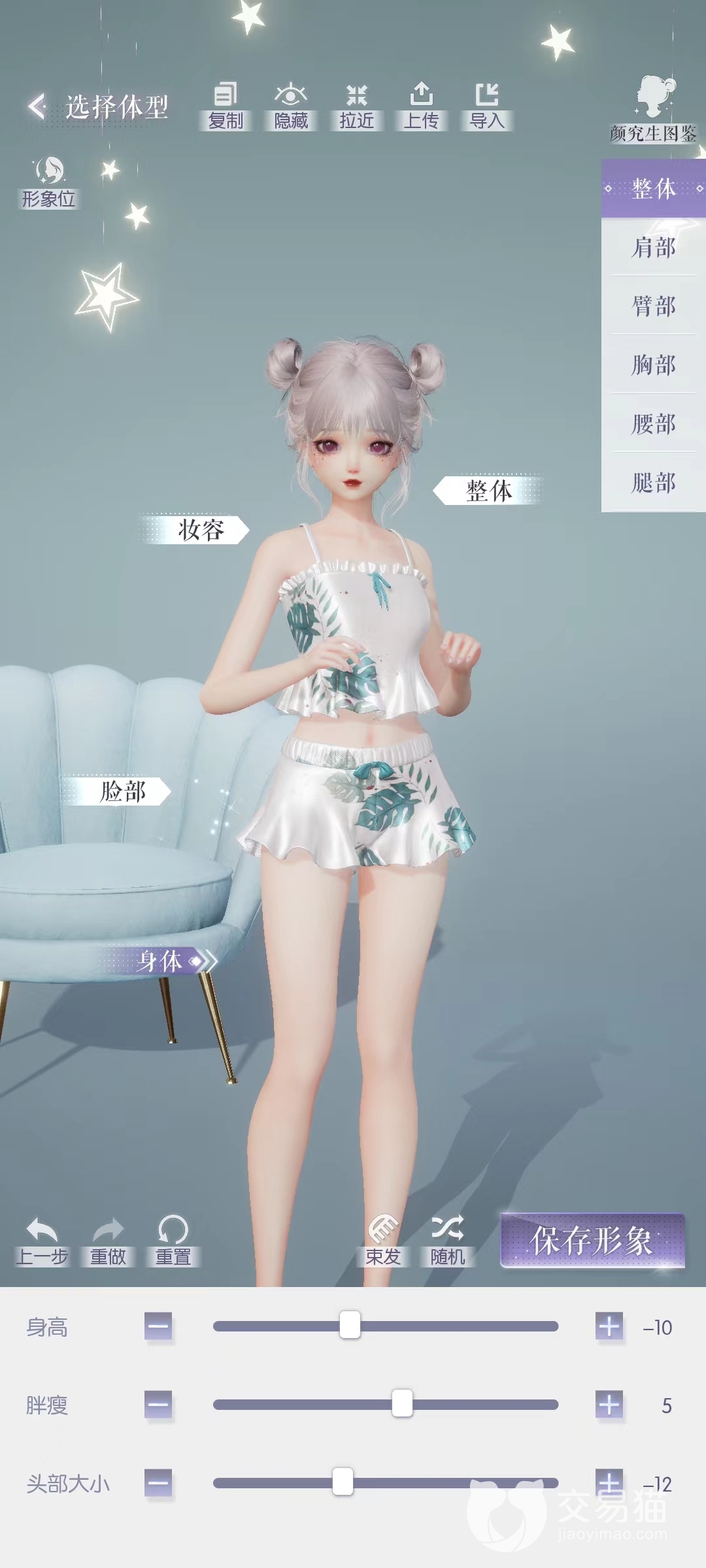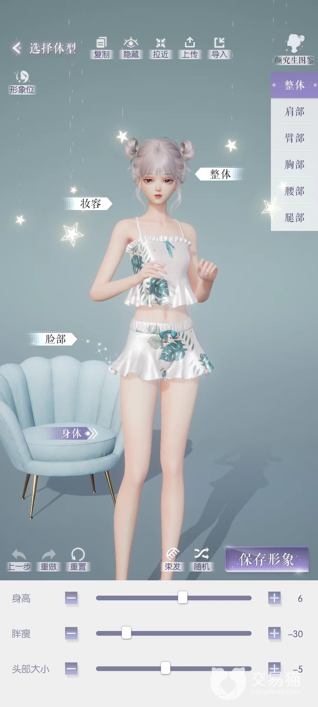 选择“身体”就可以进入捏身材的环节了。可以调整的部位有整体、肩部、臂部、胸部、腰部、腿部这几个,其中,整体包括身高、胖瘦、头部大小。