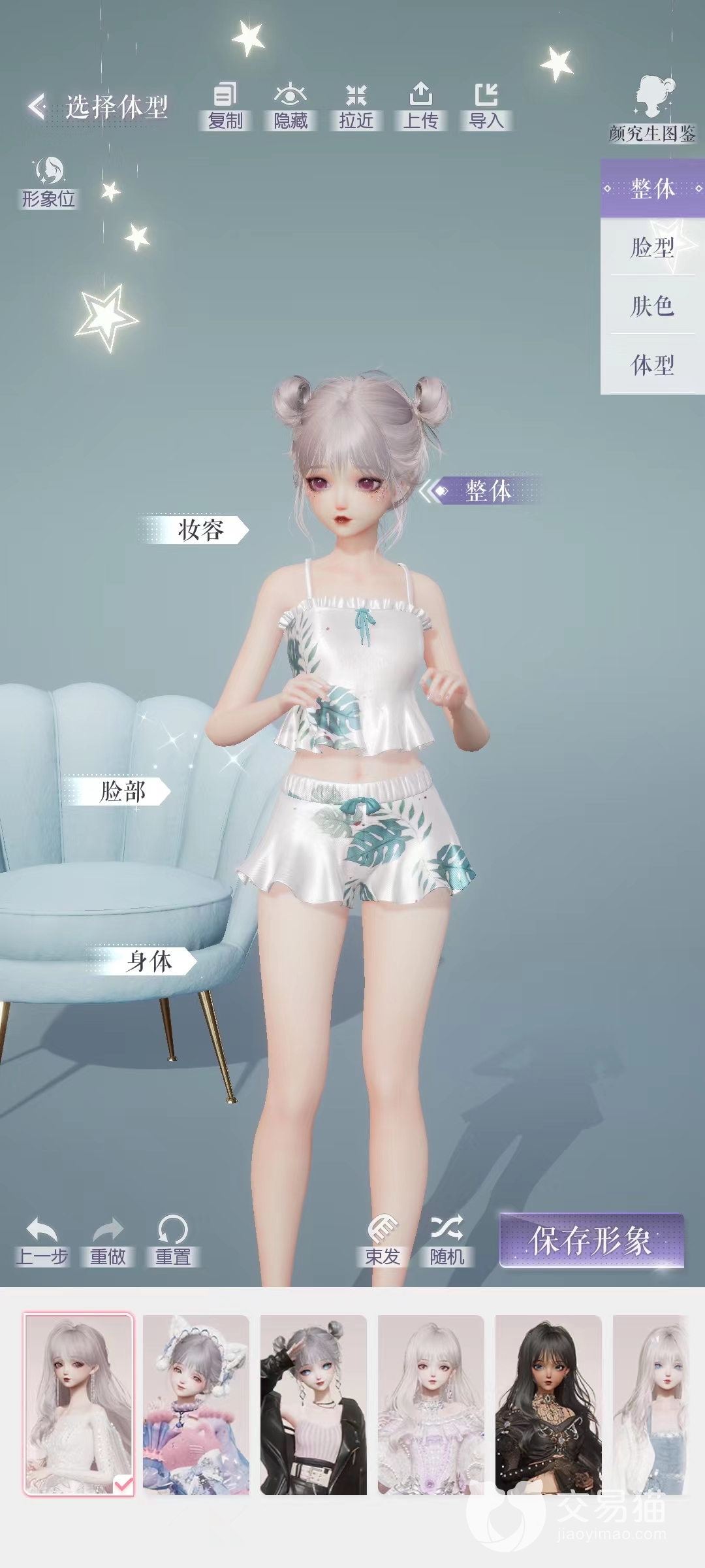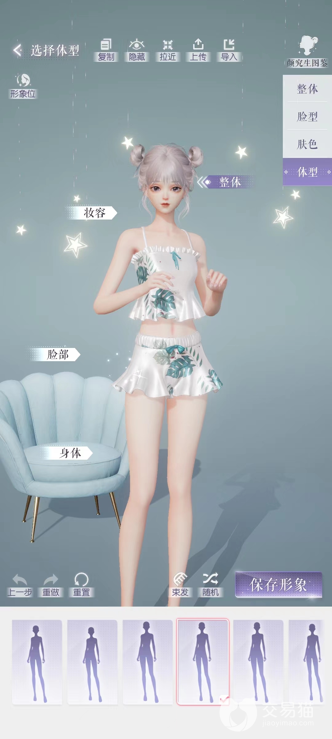 选好体型后,就会进入捏脸和捏身材的细节调整。这里我们选择“整体”,还会再看到一个“体型”。这个体型下会有官方设置的好几个身材选项,有的玩家如果嫌麻烦,就可以直接在这里选择。