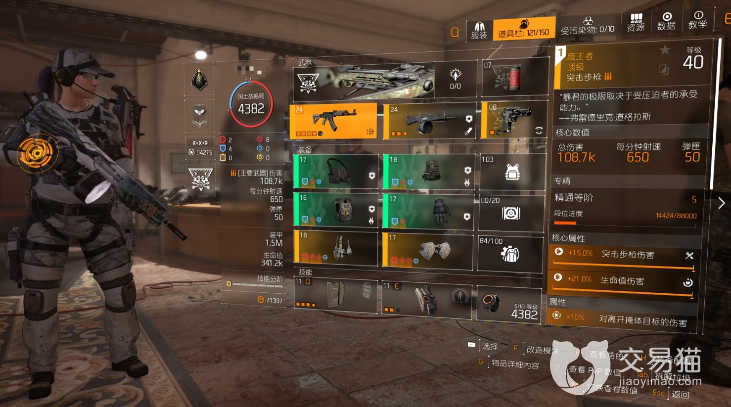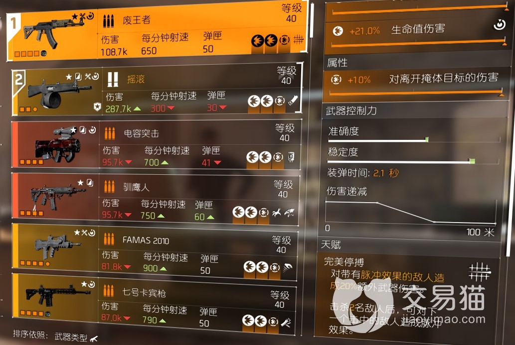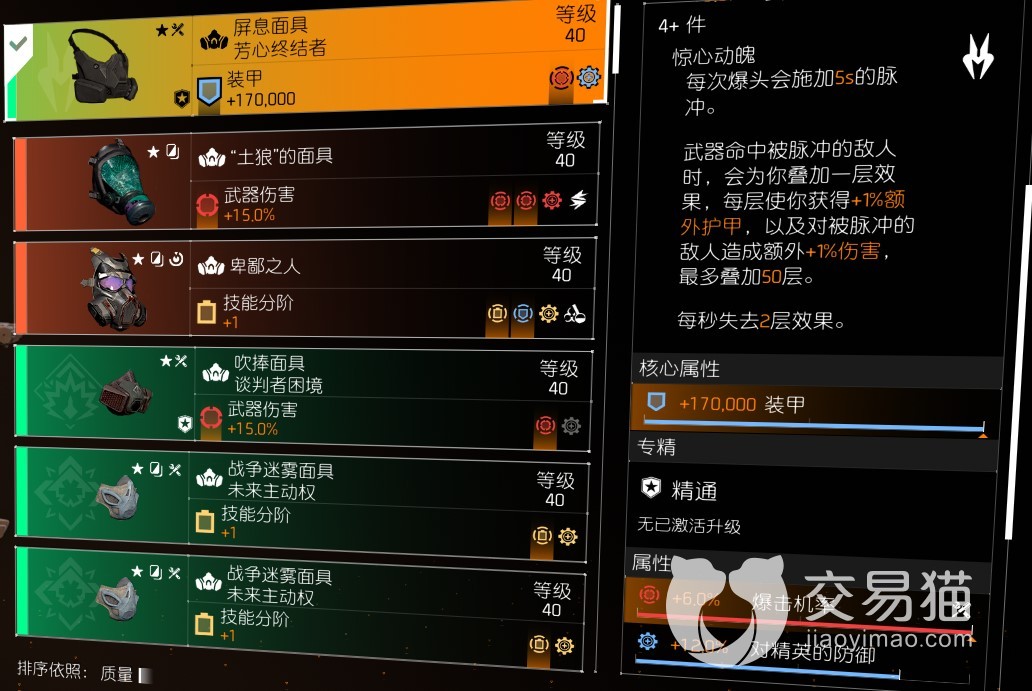 主武器用废王者,对离开掩体的敌人有伤害加成,天赋对脉冲敌人有伤害加成。副武器摇滚,同样是对离开掩体敌人伤害加成,天赋增加弹容量,打起来近距离用摇滚可以叠芳心buff。面具用土狼,团队爆率暴伤加成,背包捷克,25%武器总伤,而且有装甲加成的时候受伤也不会中断这个效果。芳心防弹衣,提升芳心buff上限到100层,关键装必备。然后是芳心手套、枪套、护膝。技能用扫描脉冲、护盾、蜂窝这三个选择其中一个,考虑到芳心套效果需要给敌人加脉冲,所以带扫描脉冲比较好。