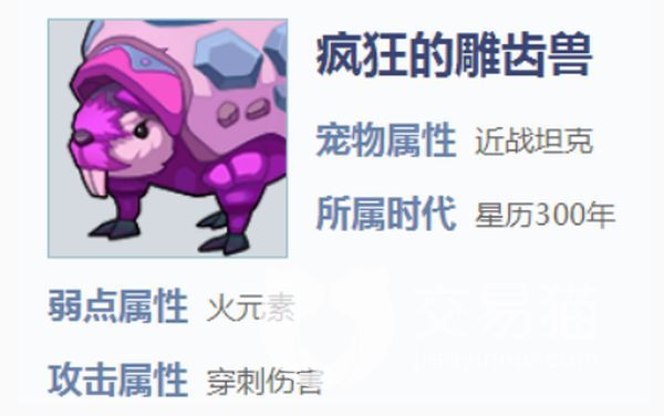 要是喜欢近战坦克型宠物的玩家推荐大家可以去游戏中试试疯狂的雕齿兽,这个宠物它的整体外形呈紫色,有点像带壳的土拨鼠,有着一对长长的板牙和小小的四肢,在外形看起来有一点可爱,它的属性是近战坦克。在游戏中它的肉度比较高,可以帮助它的主人抵挡比较高的伤害,给主人增加防御属性,它主要的攻击是穿刺伤害,可以用它坚固的甲壳以及尾巴上的尖刺对敌人造成物理伤害,大家若想获取它,需要先来到星历300年的原罪之岛中,这一类宠物它的家一般都放在独占山谷旁边的顶上,大家来到这个位置之后,就有机会遇到,再将其进行捕捉就可以了。