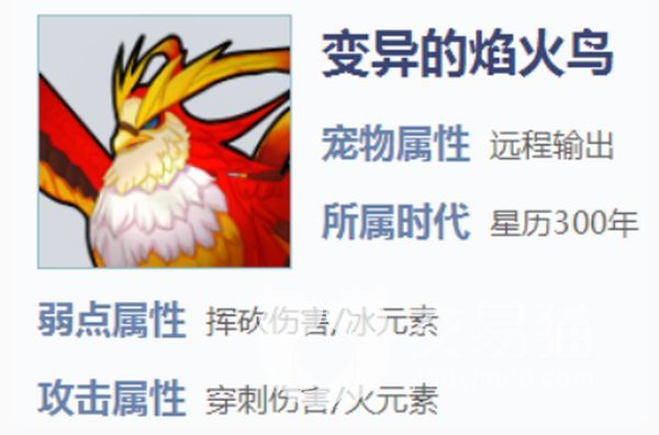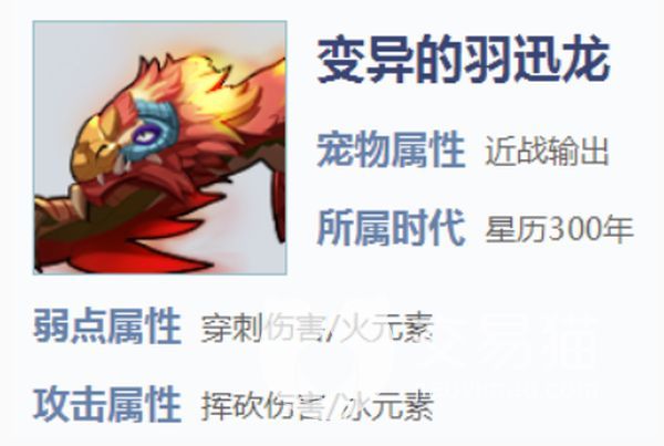 要是喜欢近战输出的宠物玩家的话,可以去选择一下变异的羽速龙,在外形上它主要呈现是红色一种火焰的感觉,它攻击的属性是挥砍伤害以及冰元素伤害,是近战输出里面最适合培养的一个宠物了,它所处的时代是星历300年,大家要想获取它的话,可以在这个地图上进行捕捉,但是捕捉的时候一定要小心一点,它的战斗力非常高,而且性格比较残暴,可以快速的将周边的一切事物撕裂开,所以大家在捕捉这个宠物的时候,一定要多加小心,但一旦获取,就能带来比较不错的效果哦。