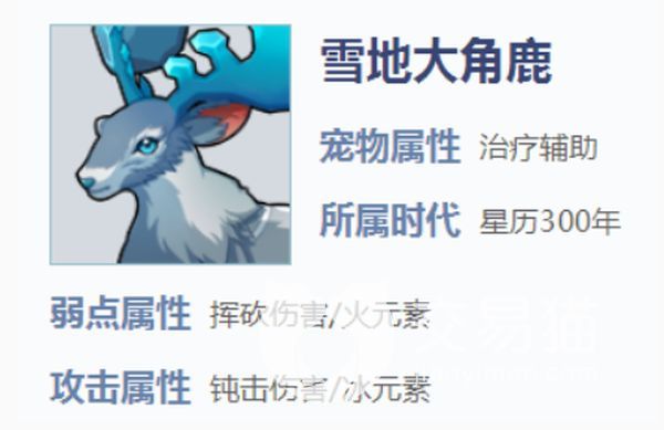 若是喜欢治疗辅助的玩家,可以去选择带上雪地大角鹿,它是一个外观上看起来非常可爱的一个小鹿,有着一对冰蓝色的大脚,身上毛的颜色主要呈现灰蓝色,是一个治疗辅助的角色,可以对敌人造成钝器伤害以及冰元素伤害,它也是大家在游戏中遇到的首个带有治疗效果的宠物,可以给它的主人进行治疗回血,虽然它不适合与敌人进行战斗,但是他的治疗水平是比较高的若是再搭配上防御装备的话,就能在游戏中带来更好的效果哦。大家若想捕捉它的话,可以来到星历300年,然后在那里获取哦。