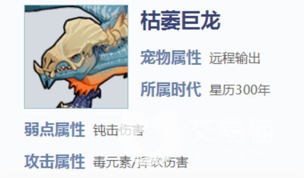 在这个游戏中,宠物主要分成四个不同的种类,其中有远程输出,近战输出和近战坦克以及治疗辅助,这四个不同的位置有着不同的技能效果,首先在远程输出中最推荐大家去使用的一个宠物名为枯萎巨龙,它在外观上是一个蓝色巨大的龙,头顶还带着一个骷髅,看起来就非常的厉害。它的属性是远程输出攻击是毒元素以及对敌人造成挥砍伤害,大家要想获得这个宠物的话,需要去星历300年在那里进行捕捉。它在游戏中可以跟着远程攻击的主人,然后在距离敌人比较远的距离并攻击敌人,对敌人造成比较高的伤害,而且z韩国宠物在后期的话,经过玩家的培养还能得到很大程度的提升,伤害也会更高,因此是比较推荐大家去使用的一个宠物。另外从它的介绍中能看出来,它非常的厉害,看过它的人都没有离开过那个地方,是游戏中多位冒险者最喜欢的一个远程输出宠物。