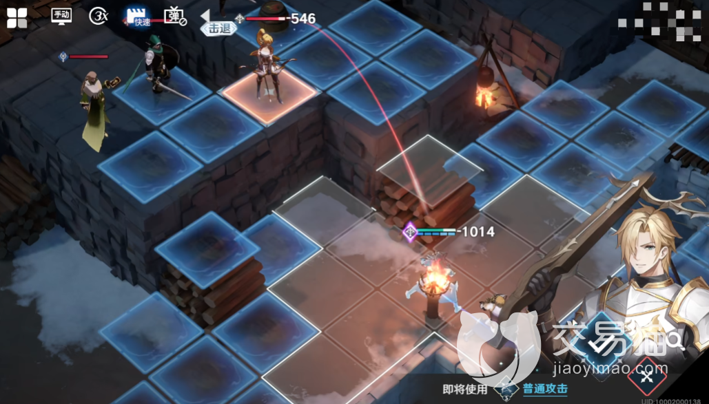 那么进入对局后,大家可以先操控那名女角色,将其移动到下方一名敌人面前,并对其进行攻击使其掉下去。然后可以操控另一个男角色,让其向前一步让上面高台上的一名敌人在自己的射程范围内,并攻击对方将其击落。