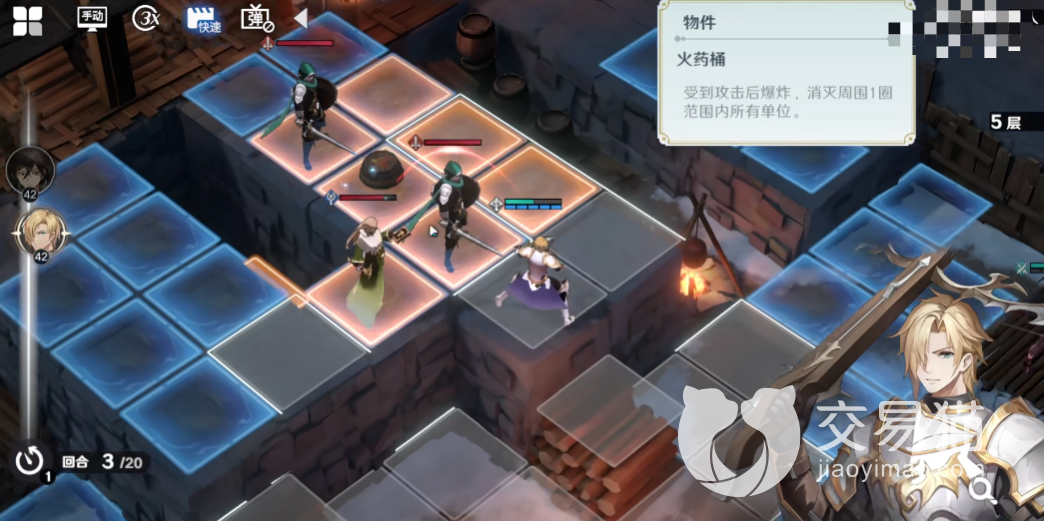 然后下一回合可以将女角色移动回来,随后让那个男角色移动到高处的平台上面,随后等对方走完以后,各位就可以操控女角色移动到最右边的那个敌人面前,并将其击败,而后可以使用男角色攻击前面的火药桶,让其将周边的敌人都炸掉。